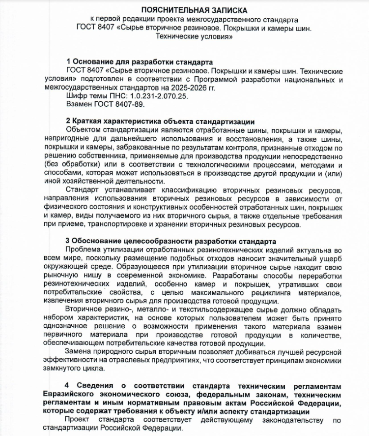 Проект первой редакции ГОСТ «Сырье вторичное резиновое. Покрышки и камеры шин. Технические условия» (шифр темы ПНС: 1.0.231-2.070.25