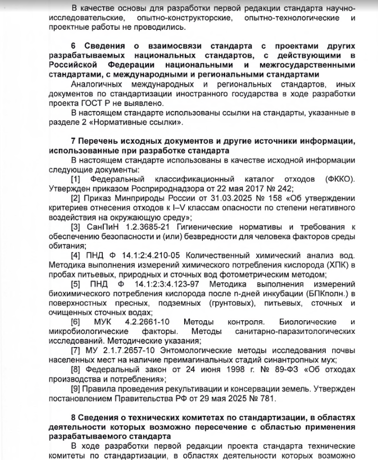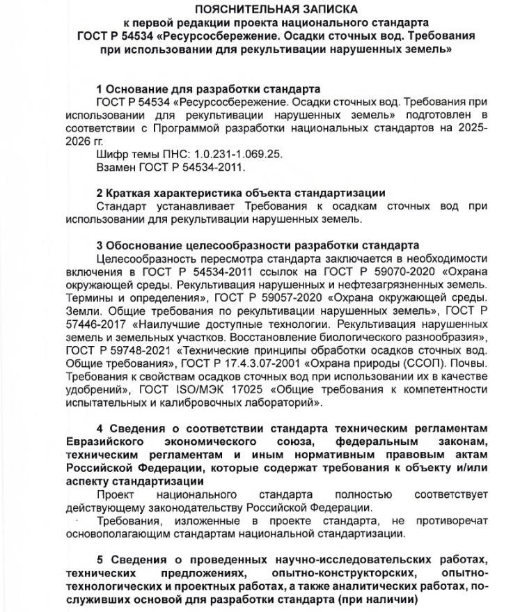 Проект первой редакции ГОСТ Р «Ресурсосбережение. Осадки сточных вод. Требования при использовании для рекультивации нарушенных земель» (шифр темы ПНС: 1.0.231-1.069.25)